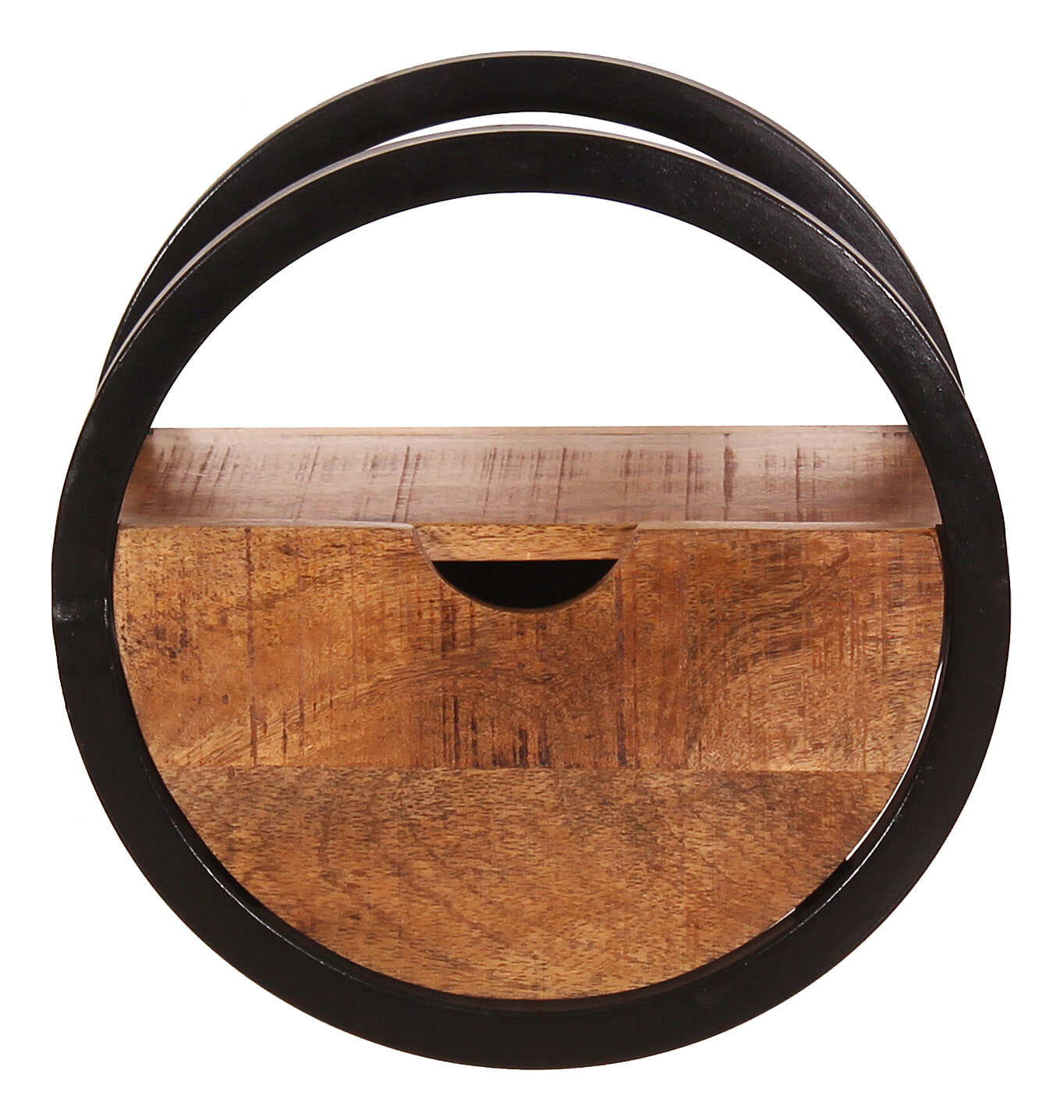 Deze magische wandplank onderscheidt zich van de massa. De ronde plank van naturelkleurig acaciahout en een antiek zwart metalen frame kun je individueel ophangen en zo je creativiteit de vrije loop laten. De industriële look is een absolute blikvanger. Kleine spulletjes vinden hun plek in de lade, op de plank kun je decoratieve voorwerpen plaatsen. De massief houten plank is veelzijdig en kan in veel kamers worden gebruikt.