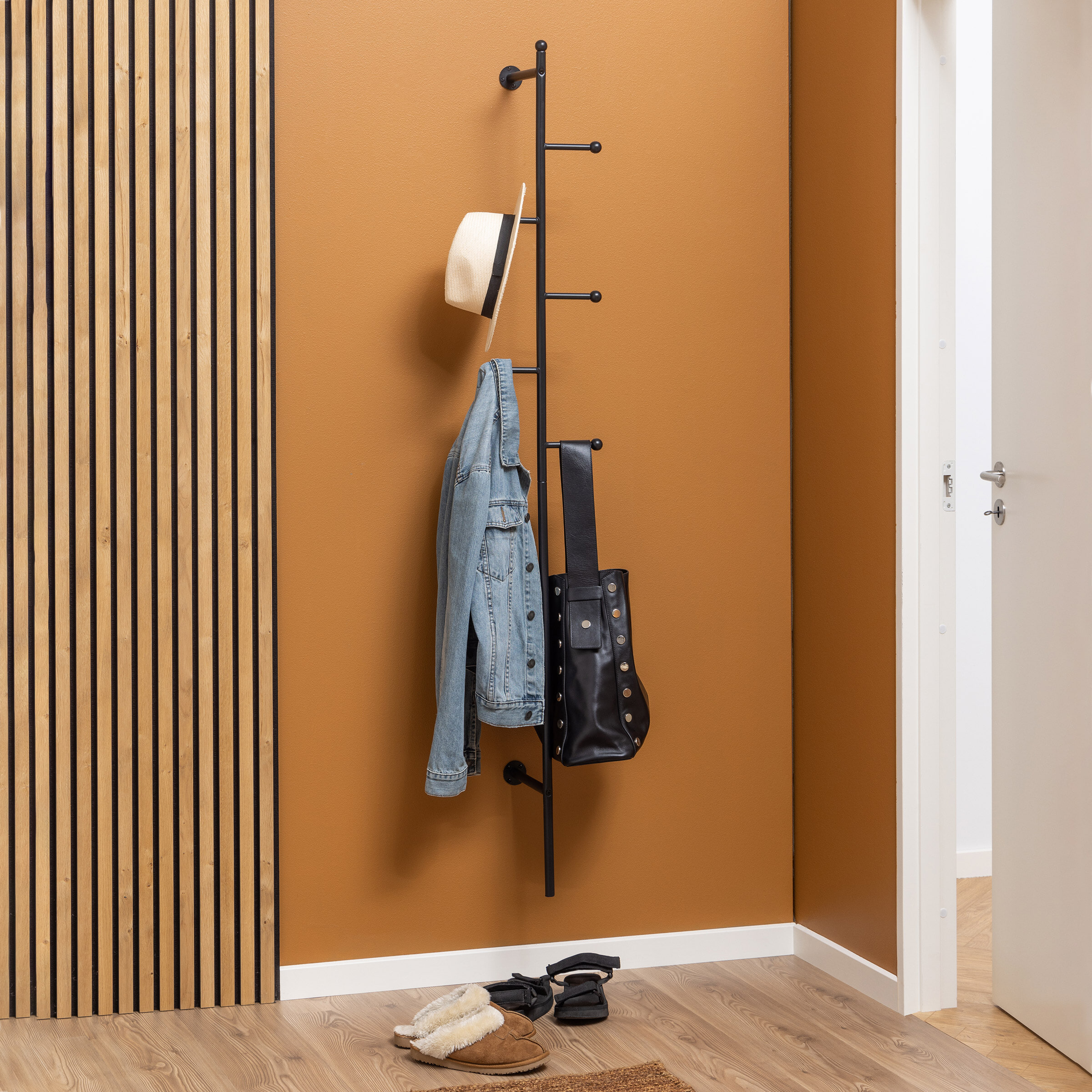 Gemaakt om overal te passen is deze verticale kleerhanger perfect voor zelfs de smalste ruimtes. Omdat dit ontwerp aan de muur moet worden bevestigd, helpt het om vloerruimte te besparen. Met 5 haken zorgt hij voor je bovenkleding en misschien een paraplu of een tas. De strakke lijnen en het zwarte metaal geven de hanger een coole, industriële vibe.