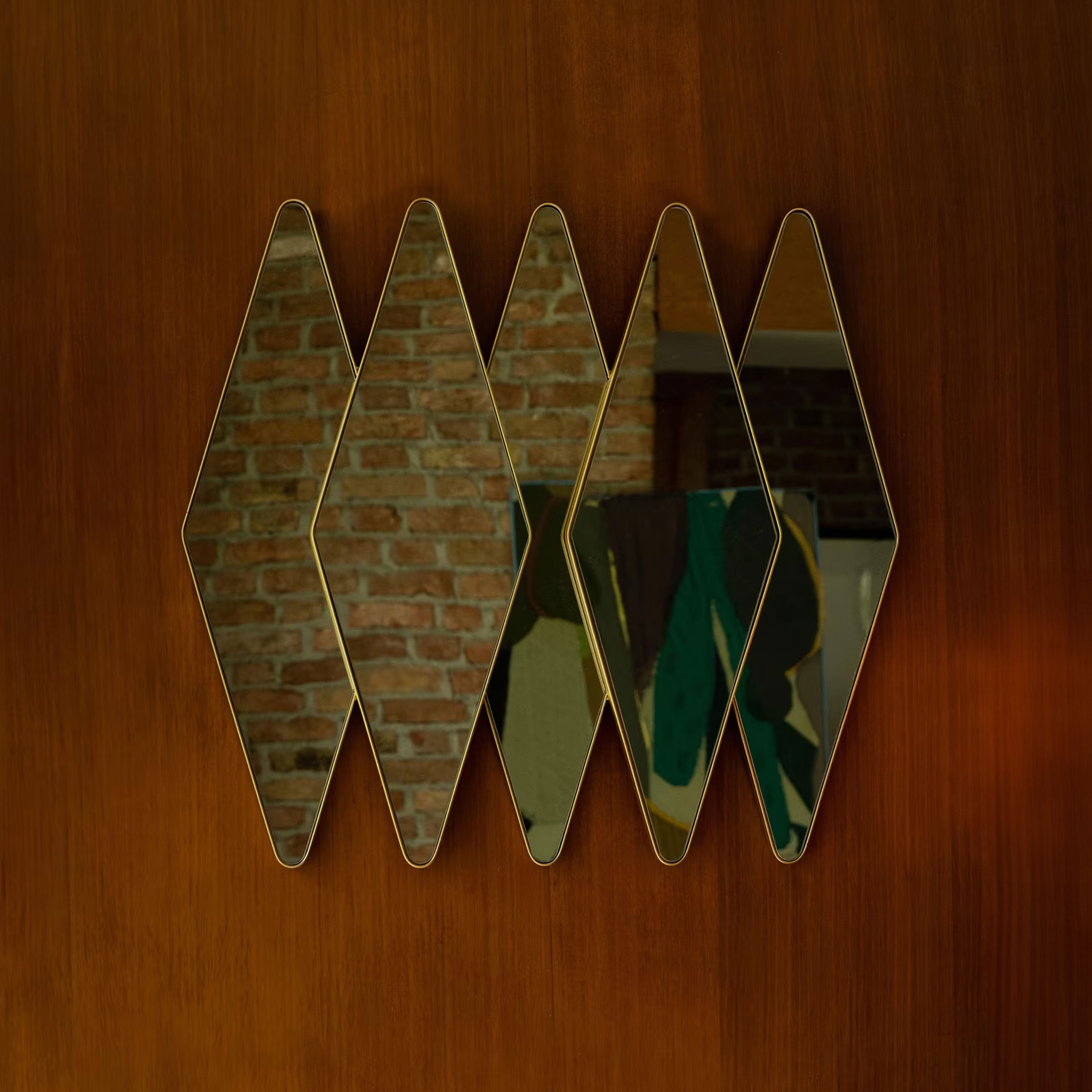 Wil je een wand omtoveren tot jouw favoriete plek in huis? Dan is de Dutchbone Kyoko de perfecte keuze. Deze bijzondere spiegel voegt met zijn unieke design namelijk direct meer karakter toe aan de ruimte. De spiegel bestaat uit een reeks van vijf ruitvormige spiegels met afgeronde hoeken, die samen één geheel vormen. Het geometrische patroon dat hierdoor ontstaat, doet direct denken aan de jaren 70 en zorgt dan ook voor een fijne vintage feel. Dat gevoel wordt compleet gemaakt door de messingkleurige rand, waarmee de spiegels stuk voor stuk zijn afgewerkt. Hiermee is de spiegel een waar kunstwerk te noemen, waarmee je de kamer zowel ruimtelijker als sfeervoller maakt.