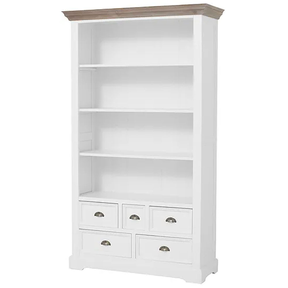 Het romantische en landelijke meubelprogramma Fleur bestaat uit diverse trendy, witte meubelen met vergrijsde houten bladen.De boekenkast biedt naast voldoende ruimte voor uw boeken ook nog handige opbergladen.Afmeting: 111x40x191 (h)cm Kleur: C027 White RAL 9010 – pine old greyBekijk ook de andere meubelen van het romantische programma Fleur.Levertijd: 2 – 4 weken