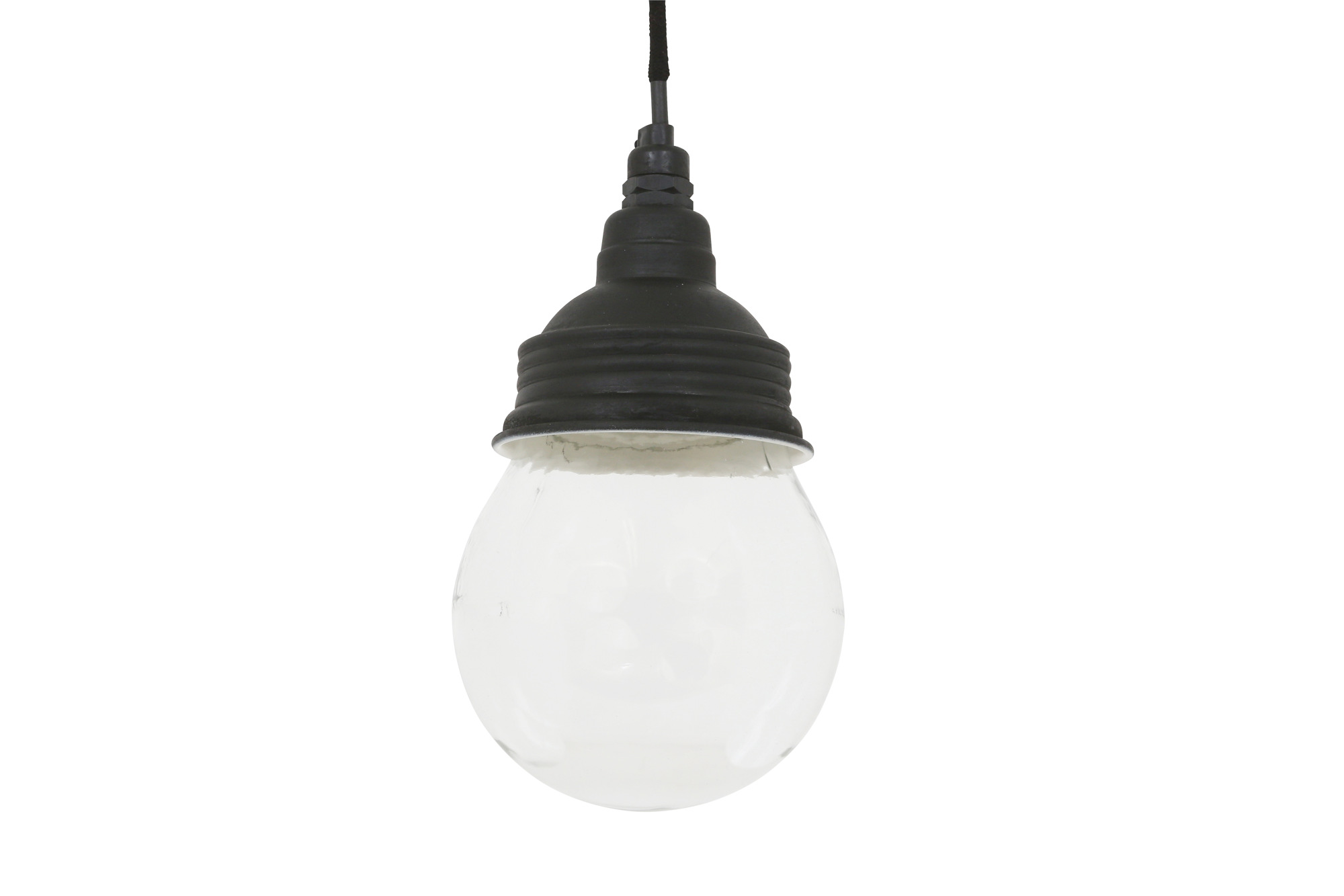 Een bijzondere hanglamp waarvan het ontwerp gebaseerdĀ is op een lampfitting, in de kleur antiek zwart. De lamp is vervaardigd van messing en heeft een helder glazen bol met een diameter van 15 cm, de totale hoogte van de lamp -zonder snoer- is 25 cm.