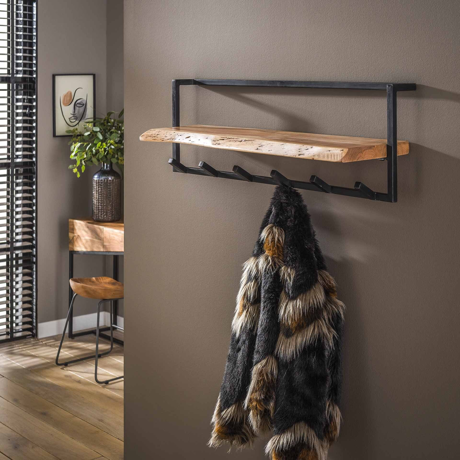 Deze kapstok is voorzien van een hoedenplank gemaakt van massief acacia hout. Zorgvuldig geselecteerd hout, voorzien van een fijne nerf en diverse noesten, die op ambachtelijke wijze wordt verwerkt. Dit zorgt voor een natuurlijke én unieke look aan de wand. Aan de hoedenplank zijn er 6 zwart geschuurde metalen haakjes bevestigd. De kapstok is voorzien van twee bevestiging ogen aan de achterzijde, zodat de kapstok eenvoudig aan de wand kan worden gemonteerd.
