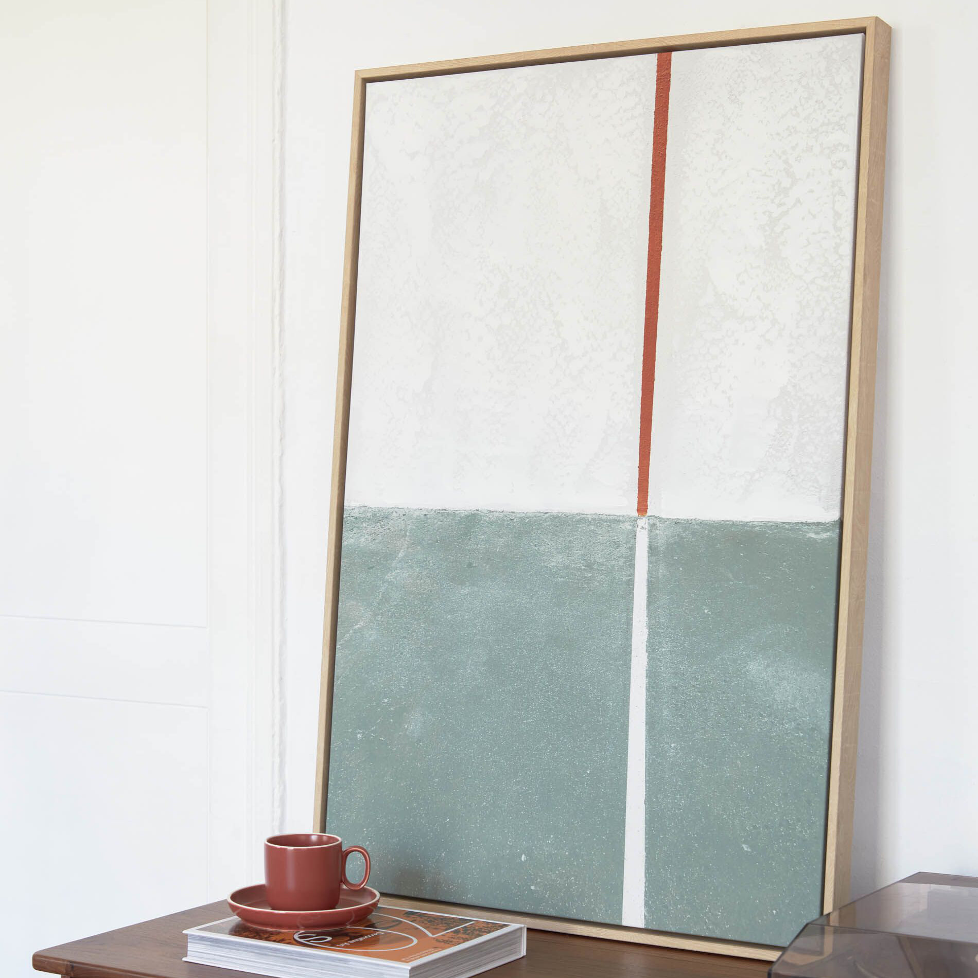 Een schilderij met abstracte vormen en contrasterende kleuren en een lijst die hun intensiteit versterkt. We hebben het gemakkelijk gemaakt om aan de muur te hangen, maar je kunt ‘m ook op een meubel zetten. Vul je ruimte met kunst.