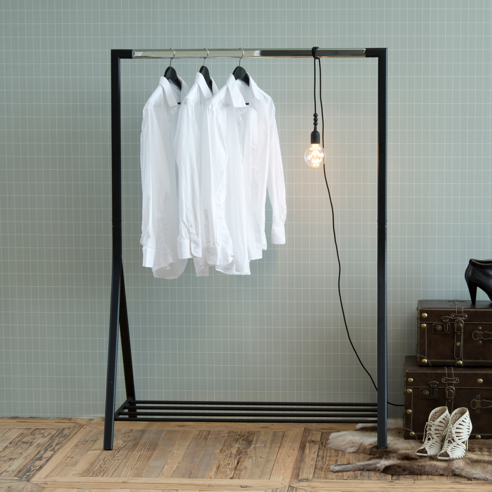 Gebrek aan ruimte voor kast, nieuwe kleding of organiseer je graag je kleding? Hoe dan ook, dit kledingrek voldoet aan de beschrijving. Het is geweldig voor het organiseren, uitstallen of plannen van je outfits. Dit exemplaar wordt geleverd in zwart metaal met chromen detail en heeft zelfs een schoenenrek dat de standaard ook extra stevig houdt. Het kledingrek laat je kleren gewoon stralen.