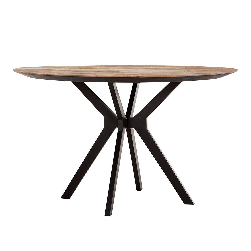 Eettafel Metropole is gemaakt van teakhout en heeft een metalen frame in boemerang vorm, dit zorgt voor een industriele uitstraling.