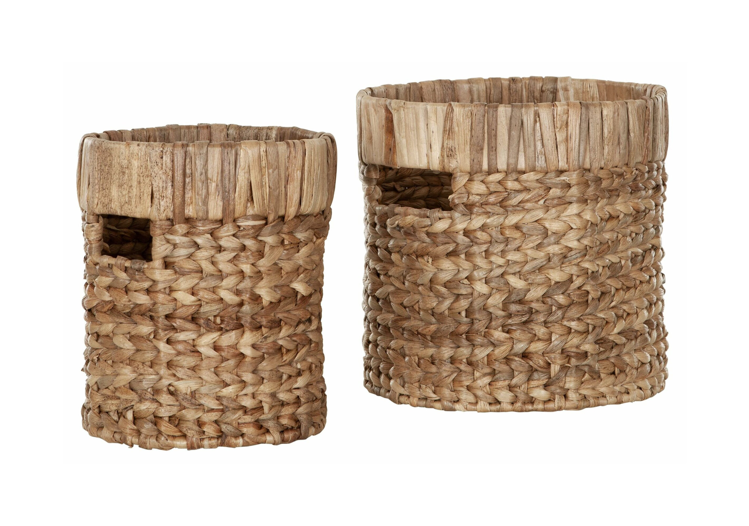 Deze set van 2 opbergboxen is qua grootte ideaal voor in een kast of op je bureau. De boxen zijn gemaakt van waterhyacint, een bijzonder en duurzaam materiaal. Ze hebben een afmeting van 25xØ24 cm en 20xØ26 cm.