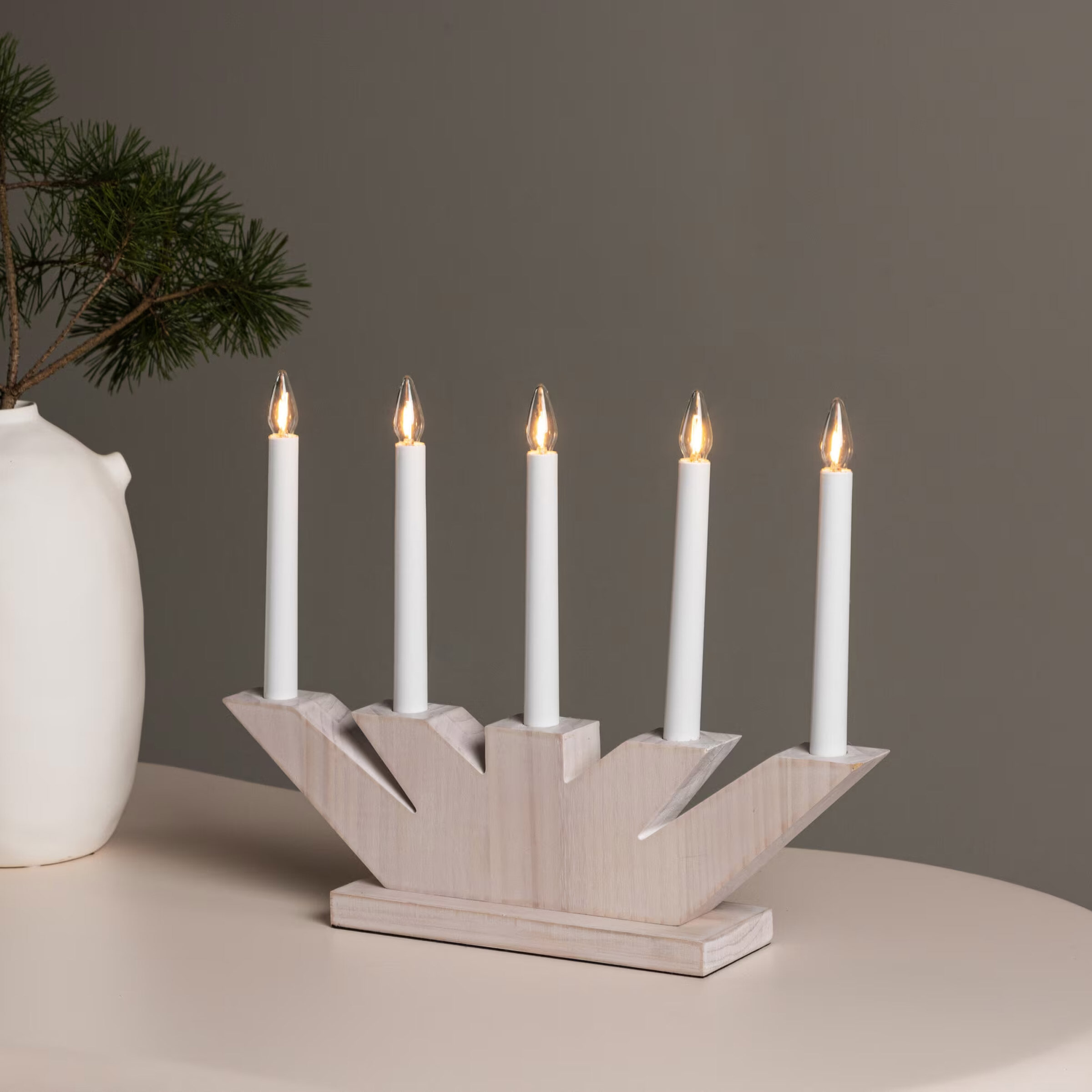 Geef je huis een vleugje natuurlijke elegantie met de Clarrisa adventskandelaar. Deze prachtige adventskandelaar is gemaakt van witgekalkt dennenhout en biedt een stijlvolle interpretatie van de traditionele adventsversiering. Met de vijf meegeleverde lampjes verspreidt hij een zachte en uitnodigende gloed en creëert hij een sfeer van anticipatie op Kerstmis.