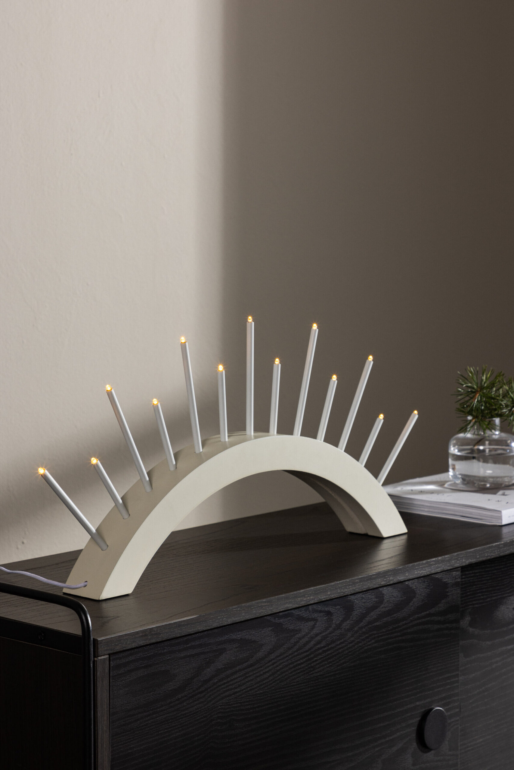 Geef je huis een vleugje Scandinavische charme met de Labrandon adventskaarshouder. Deze elegante adventskandelaar is gemaakt van witgekalkt MDF en biedt een stijlvolle interpretatie van de traditionele adventsversiering. Met in totaal 13 meegeleverde lampjes verspreidt hij een warme en uitnodigende gloed en creƫert hij een sfeer van anticipatie op Kerstmis.
