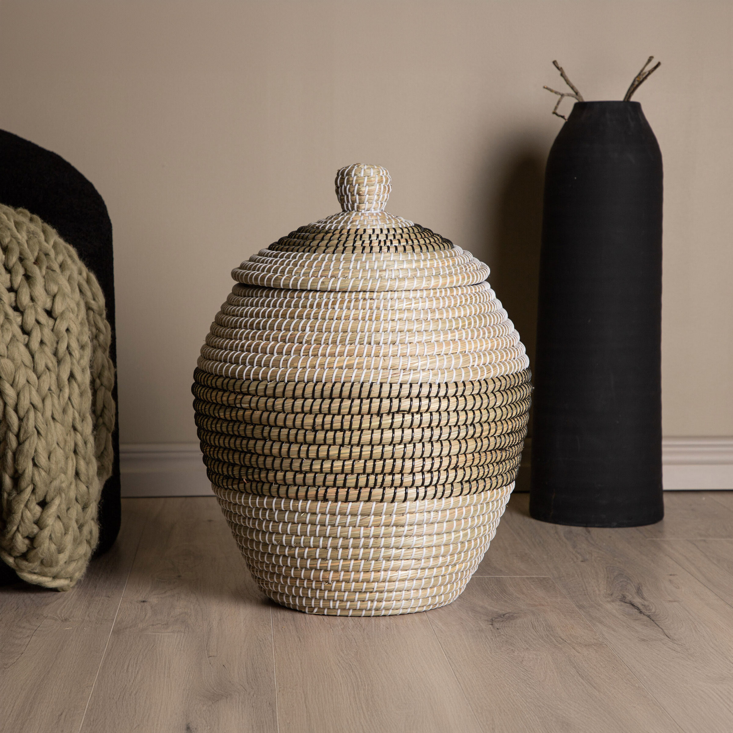 Lashann is onze ronde opbergmand met deksel! Deze mand kan voor veel gebruikt worden; handdoeken in de badkamer, minder opbergruimte in de woonkamer of waarom zou je hem niet vullen met speelgoed in de kinderkamer? Hij is net zo decoratief als interieurdecoratie, hij is functioneel en past in verschillende kamers. De mand is naturelkleurig en groen met witte details. Versier je huis slim en netjes!