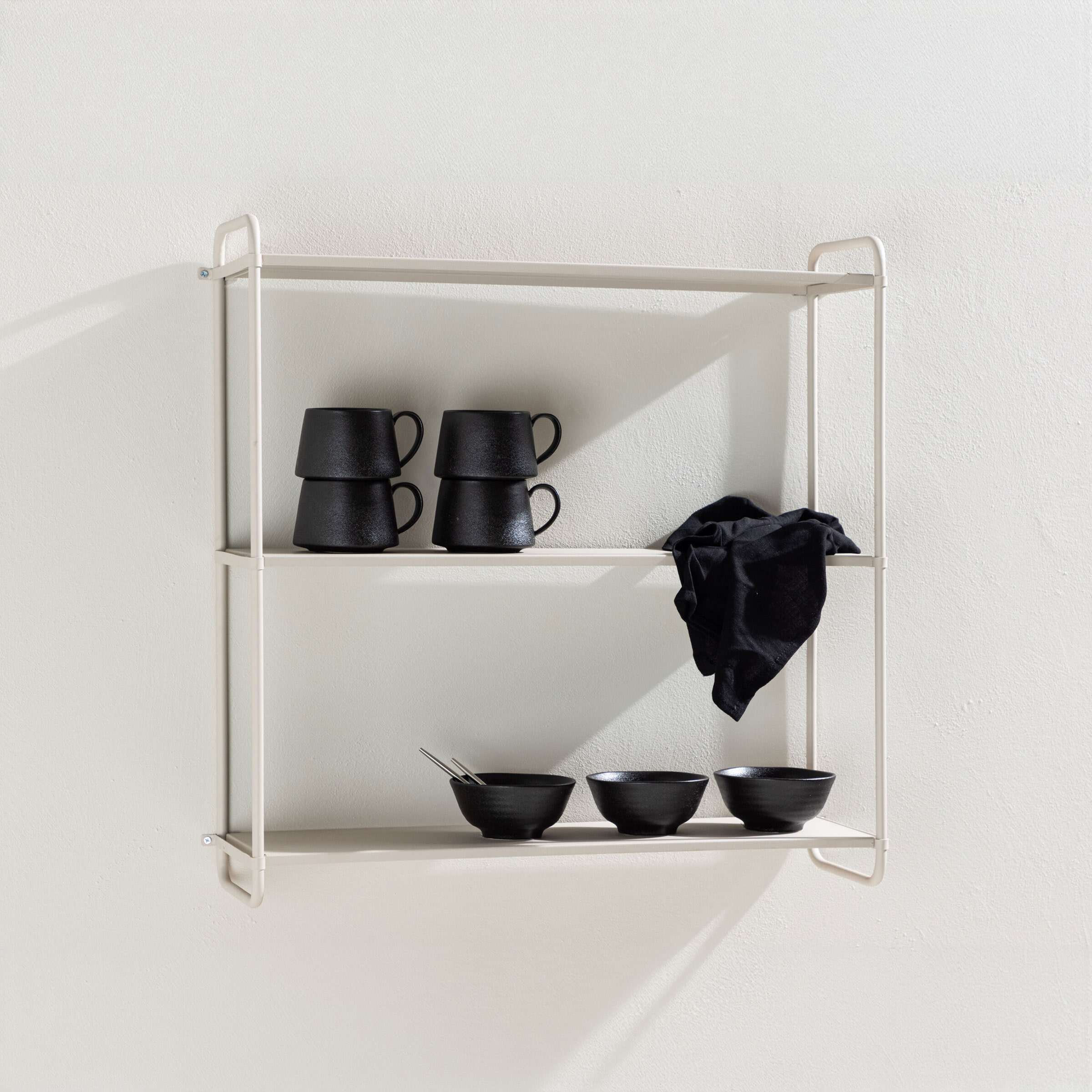 Deze wandplank is gemaakt van beige gepoedercoat ijzer dat naadloos past in verschillende stijlen en huizen. Het klassieke ontwerp gaat nooit uit de mode en geeft je kamer een elegant tintje. Met drie slanke planken en een langwerpig ontwerp biedt Jaymie een stijlvolle ruimte voor je mooie decoraties. Hier kun je alles ordenen, van boeken tot planten en kaarsen. Houd je ruimte georganiseerd en elegant.