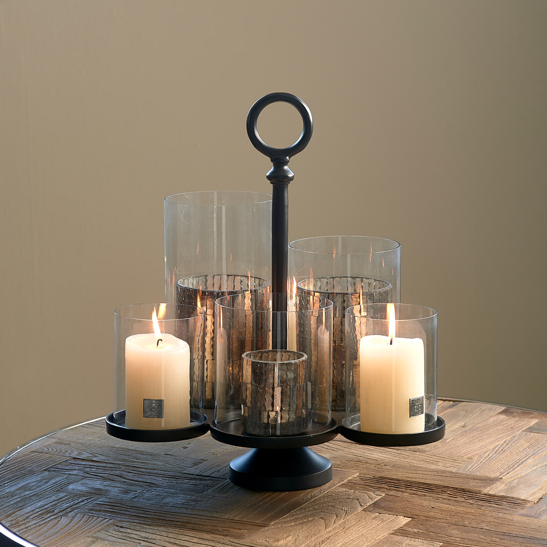Deze matzwarte houder voor wel zes windlichten is de opvolger van de succesvolle uitvoering in zilver. Hoge windlichten, lage windlichten, eventueel ook verschillende soorten, combineer maar raak en maak er wat leuks van.