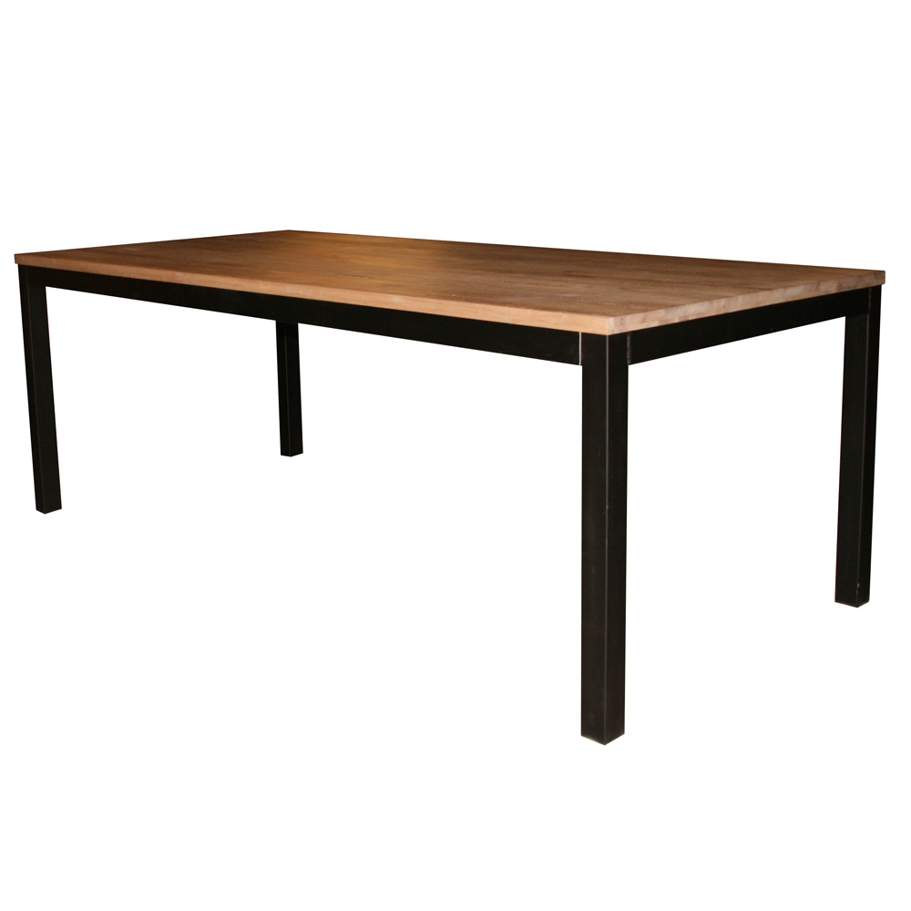 Industriƫle eetkamertafel uit het eiken meubelprogramma Tiel, kenmerkend voor dit programma zijn de zwart metalen accenten.