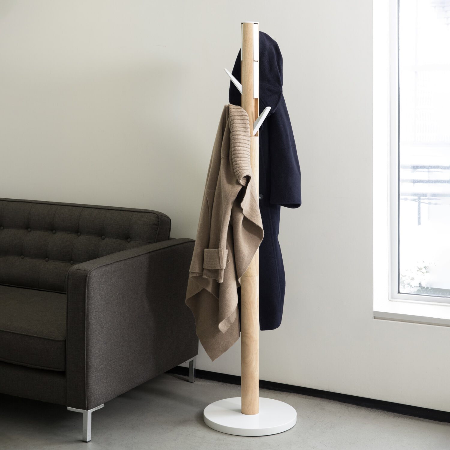 PERFECT VOOR KLEINE WOONRUIMTES Flapper heeft negen neerklapbare haken die terug in de rubberhouten paal kunnen worden geduwd als je ze niet gebruikt